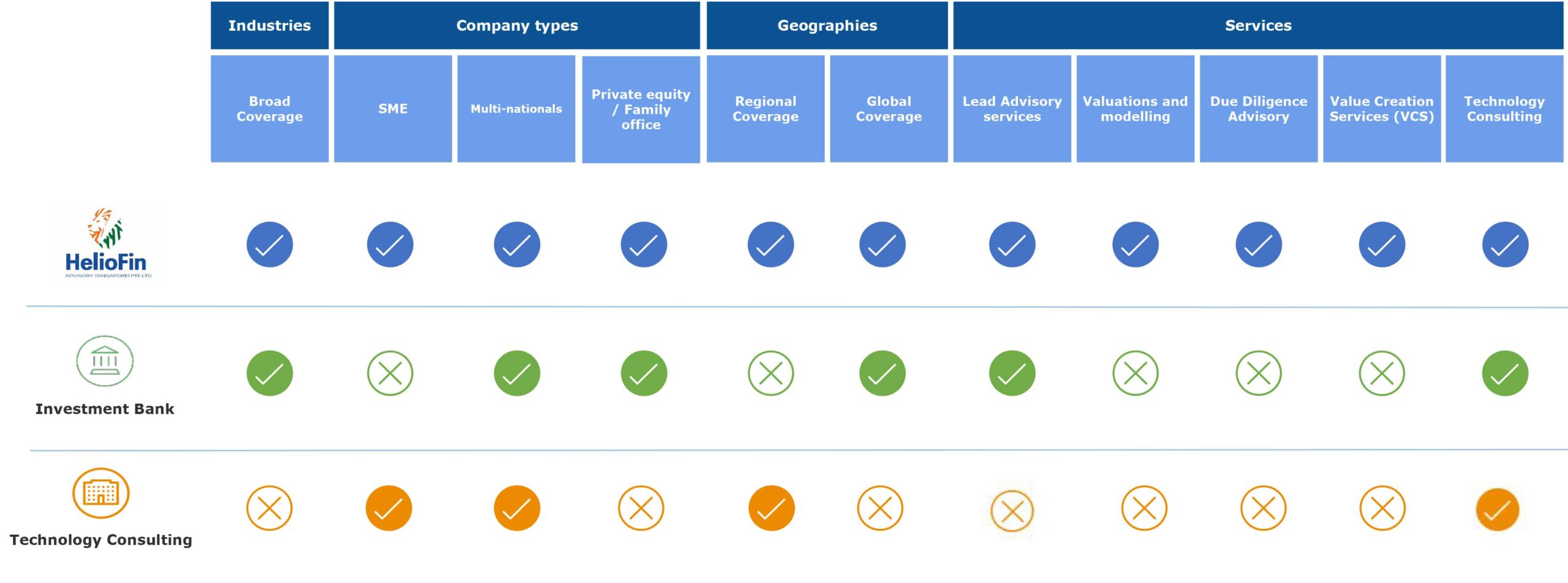 A one-stop-shop with focused services – HelioFin Advisory is an alternative to traditional investment banks and technology consulting firms
